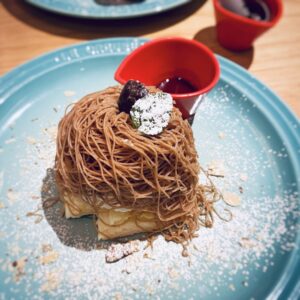 ふわふわパンケーキの上にこんもりとモンブランが乗ってますが、